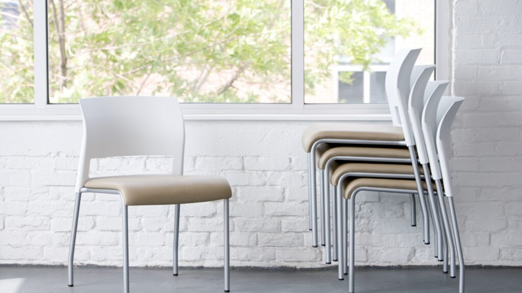 - Stackable design — chairs with legs stack 5-high on the floor, or up to 10-high on an optional dolly