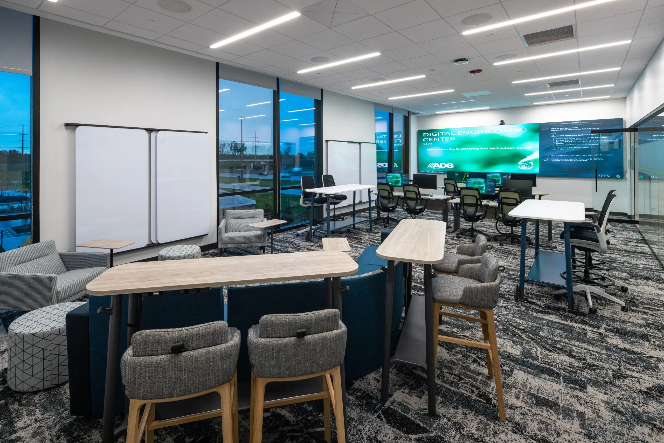 The completed headquarters in Hilliard, Ohio, delivers a dynamic, people-centered workplace that is more than just a building—it’s a catalyst for what’s next at ADS. Thoughtful design, collaborative spaces, and future-ready solutions now support innovation, productivity, and employee engagement at every level.