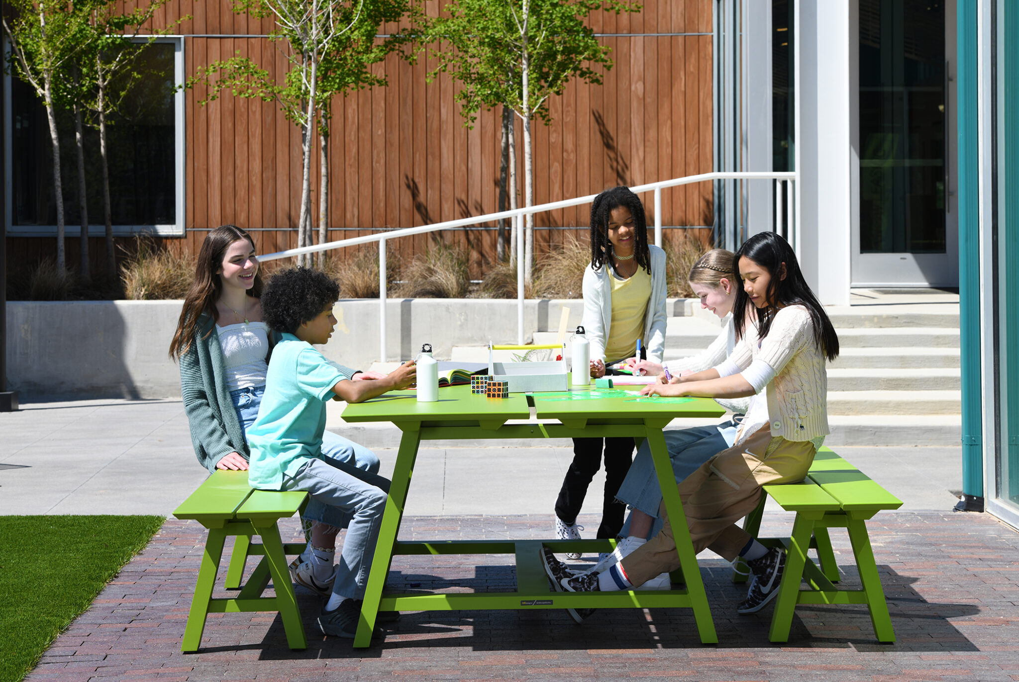 The phrase outdoor learning can mean very different things, with varying degrees of formality. The tips below apply to creating convenient, fresh-air extensions of the indoor classroom. Curating these focused learning spaces requires more structured solid seating and writing surfaces. Keep these furniture qualities in mind to maximize your school’s budget and available space:
