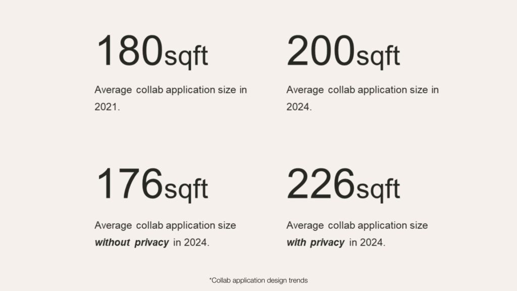 Collaborative applications have increased in size year on year from – 180sqft in 2021 to – 200sqft in 2024. Apps with privacy are notably larger than those without, reaching 226sqft  vs 176sqft in 2024. The increased application size is consistent across most industries in 2024 with the Education and Finance sectors are leading the trend. Collab apps with Flex products in them tend to be smaller than those with popular non-FLEX privacy solutions such as Lagunitas and Established & Sons. Apps with Flex Markerboards tend to be the largest of the FLEX family.