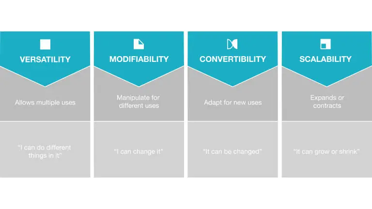 Scalability allows space to expand or contract. Space can physically grow or shrink but will need minor or major renovation. Scalability is the most complex of the four attributes and typically involves construction expertise to happen effectively.