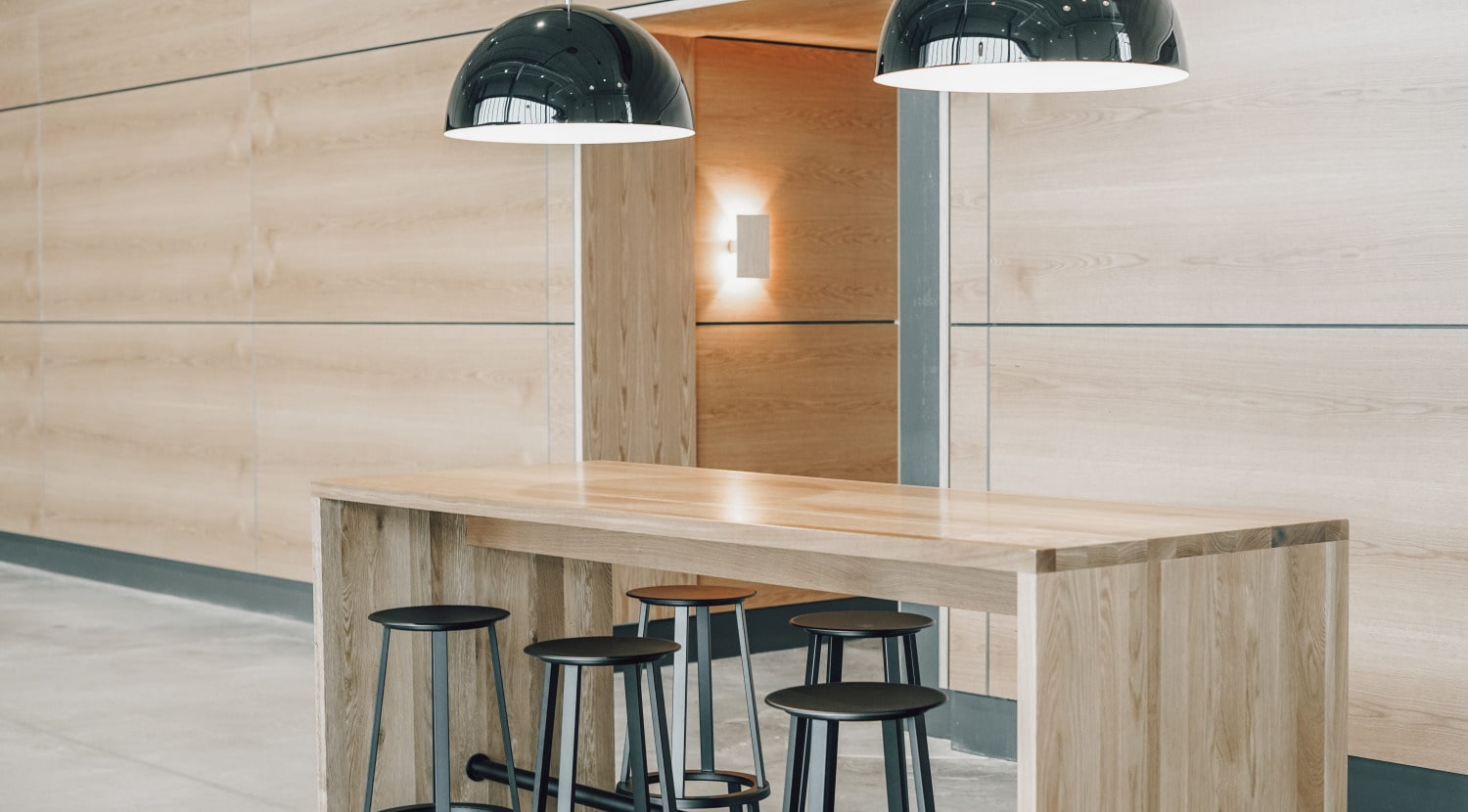 First, the team set out to create an open, modern workplace. One that reflected Henny Penny’s culture and supported new ways of working. Industrial elements like high ceilings and concrete floors were paired with warm finishes. In addition, the design prioritized a variety of spaces—personal, collaborative, and private—to support wellbeing and long-term growth.