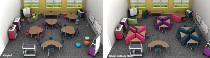 John: There are a lot of great thought starters to consider when looking at redesigning a learning space to live with COVID. Laying out a classroom to see what it looks like with social distancing (6ft or 3ft) guidelines makes a huge visual impact to see that it may not be as simple as spreading desks out or having every other seat occupied. As we prepare to return to the classroom this fall, things like deep cleaning, storage of un-used furniture, and technology improvements are all things that in a traditional education space are typically afterthoughts or forgotten about completely.