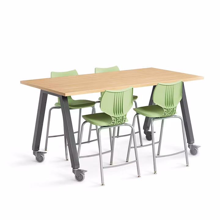 The table is offered in multiple widths (48″, 60″, 72″) and fixed heights, with either glides or locking casters; surface options include standard laminate or optional butcher-block wood; and optional accessories include a shelf kit, foot rest, backpack hook, power strip mount, or alternate surface (like whiteboard laminate) according to your space needs.