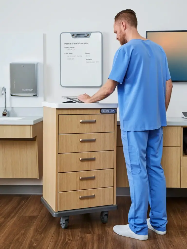Convey carts come in multiple widths (19.5″, 22.5″, 25.5″) and height ranges that support either standing use or under-counter storage. Drawer options include varied depths (4″, 6″, 8″) to tailor capacity, along with choices for keyed or keyless locks, accessory rails, and organizer kits. Tops are available in thermoform or solid-surface materials, and casters are offered in different sizes to suit mobility needs.