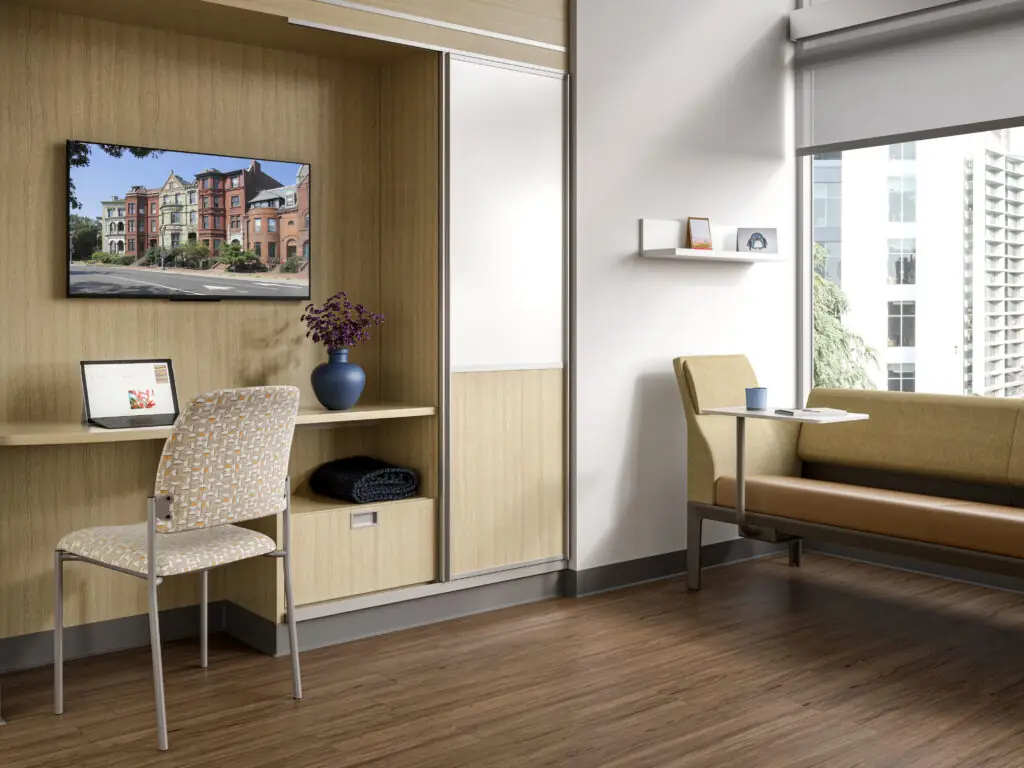 Surround Sleeper 2 is a multifunctional sleeper-sofa system designed for healthcare patient rooms, offering family members or caregivers a comfortable space to stay overnight or rest, while maintaining a compact footprint and integrating practical features for daily use.