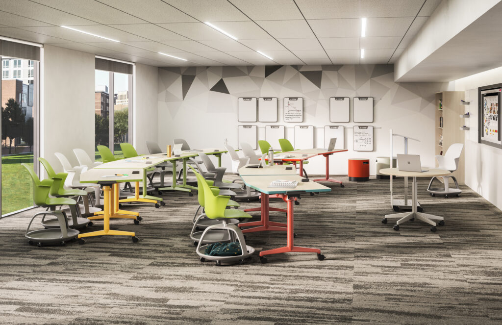 Learning environments, training rooms, active-learning classrooms, or collaborative team spaces—especially where tools for writing, display, sharing and privacy (for test or individual focus) are needed.