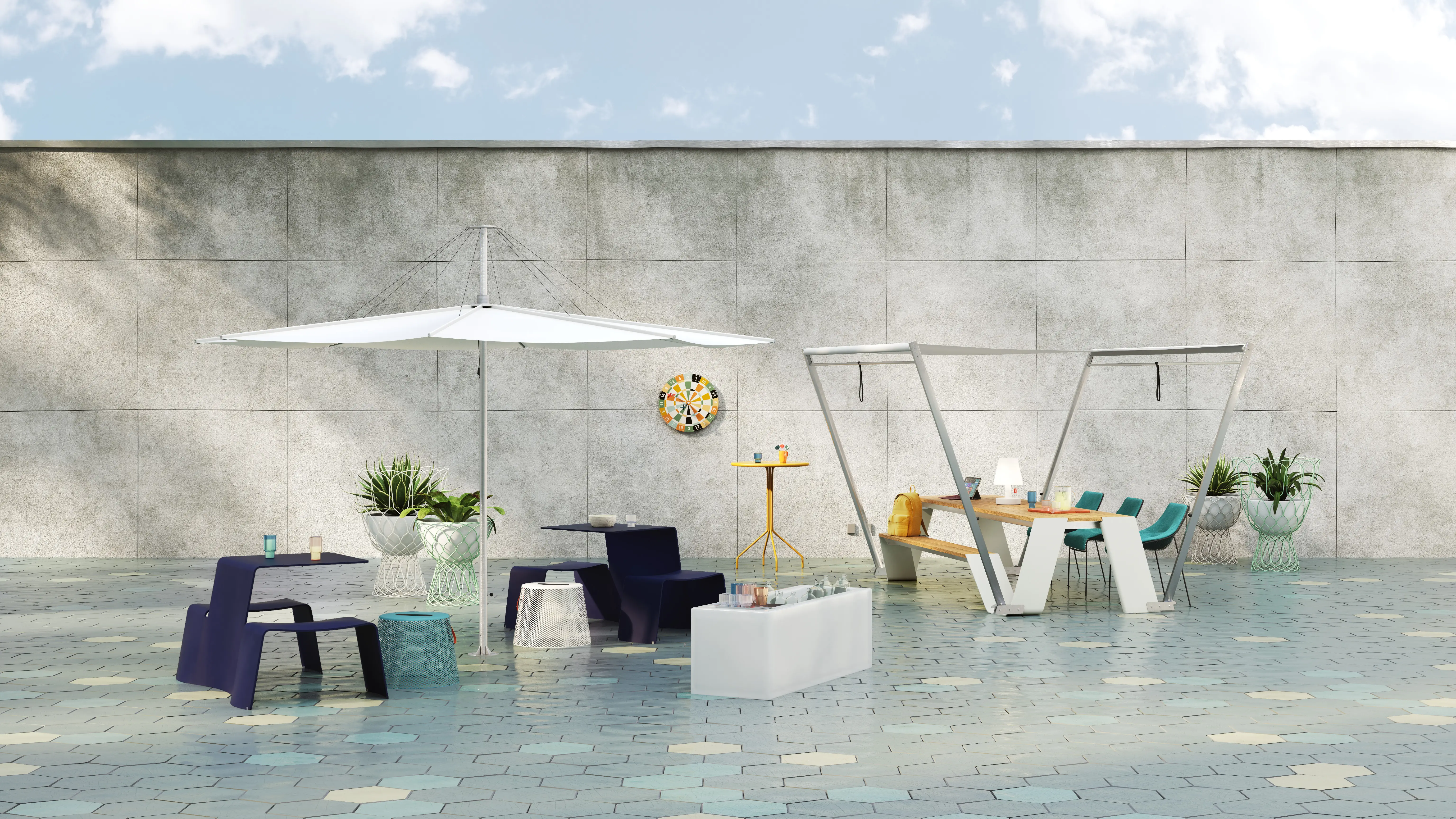 The Picnik collection by Extremis transforms the classic picnic table into an artful, minimalist form, born from a single sheet of aluminum, cut and bent to deliver strength, sculptural curves and outdoor-ready performance.