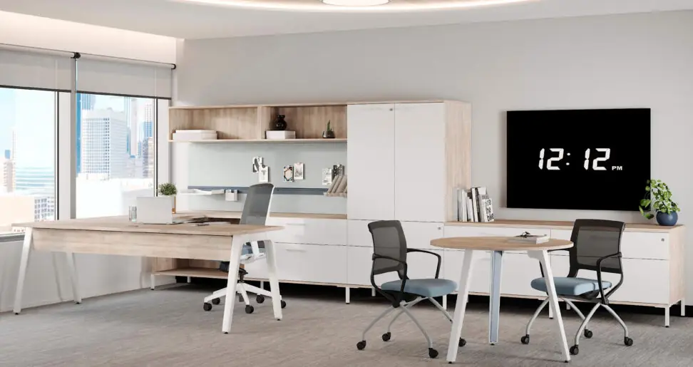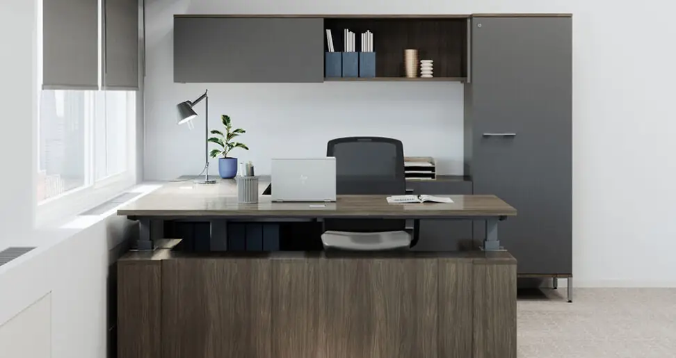 - Storage and casegood elements integrated with the desk system for seamless form and function.