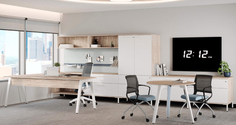 - Designed with a “lighter feel” compared to conventional casegoods: emphasizing minimalism, flexibility and adaptive storage.