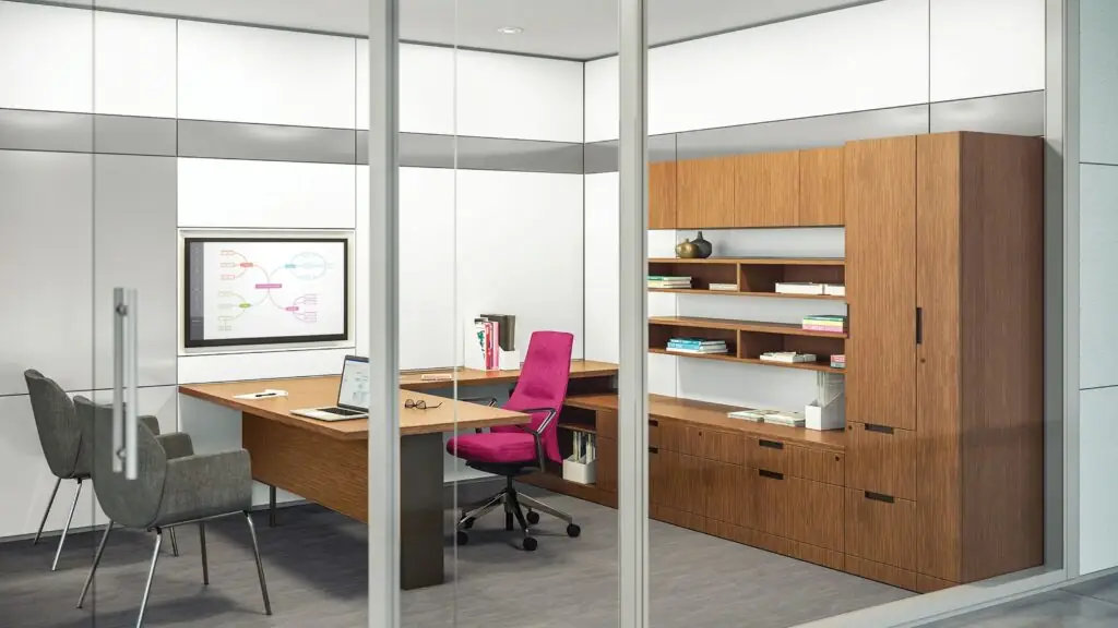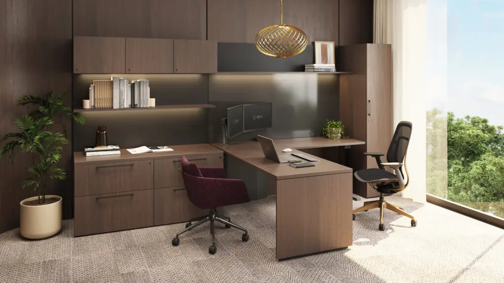 Work environments that require generous, integrated storage alongside work surfaces: private offices needing filing, credential management, display and technology support; team pods where storage supports collaboration and shared access.