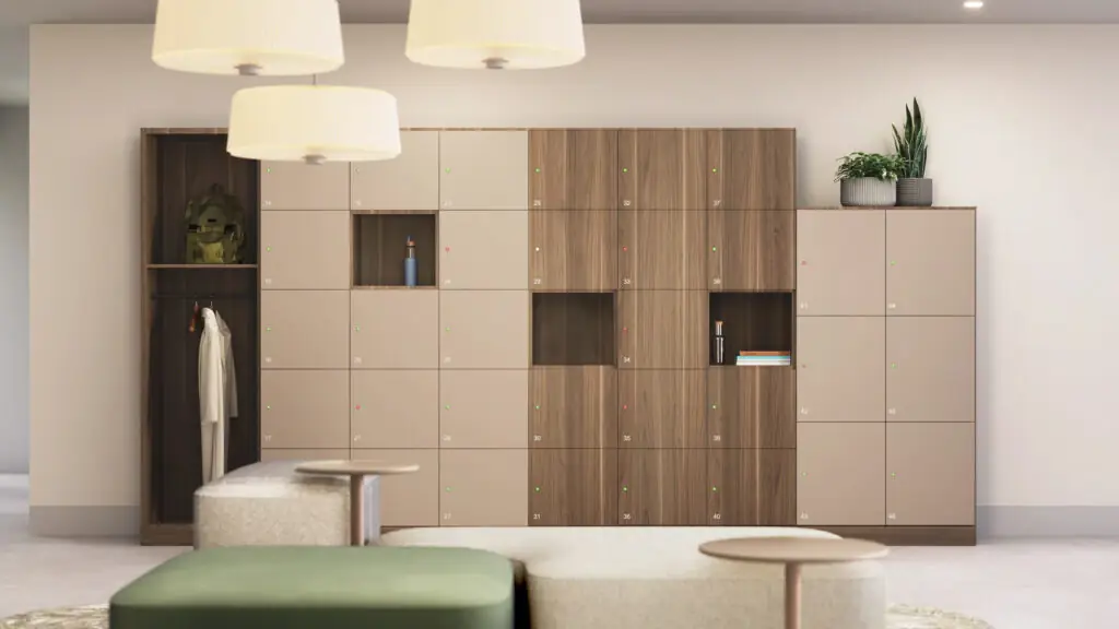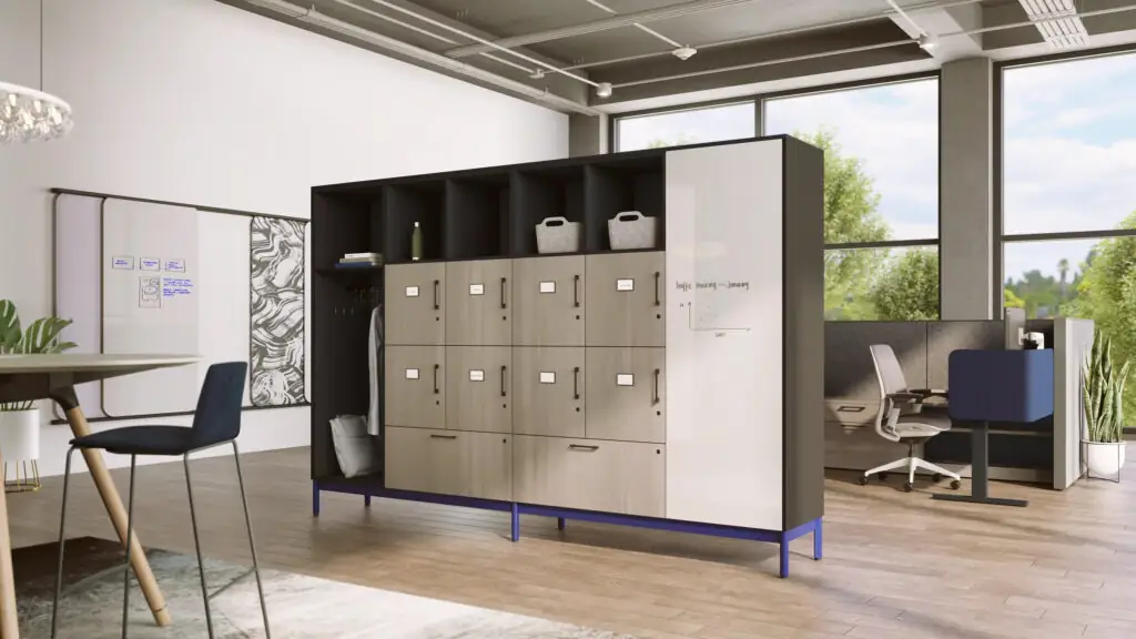 Workplaces that need secure personal storage for mobile or hybrid workers, transitions zones, shared neighborhoods, office hubs, or team spaces where individual belongings and small-tool storage matter.