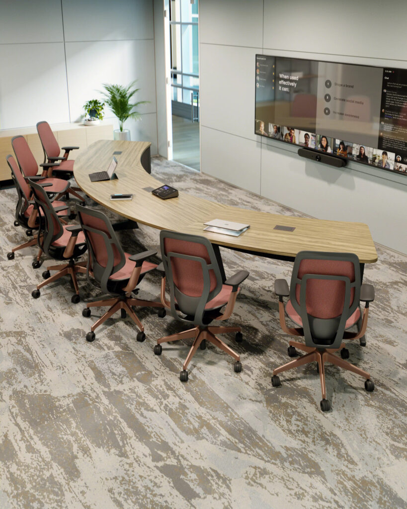 - Designed from the outset for hybrid-meeting environments (not retrofitted modern conference tables), with integrated technology and layout considerations that support both real-time collaboration and remote participation.