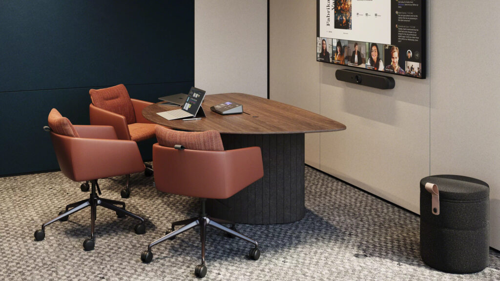 - Multiple table types for different uses: from small-team huddle-room tables to larger conference-room tables for medium/large groups. This includes compact “Coupe” tables, “Arc” curved tables for larger groups, and “Sightline” and “Arc” variants for mid-to-large meeting rooms.