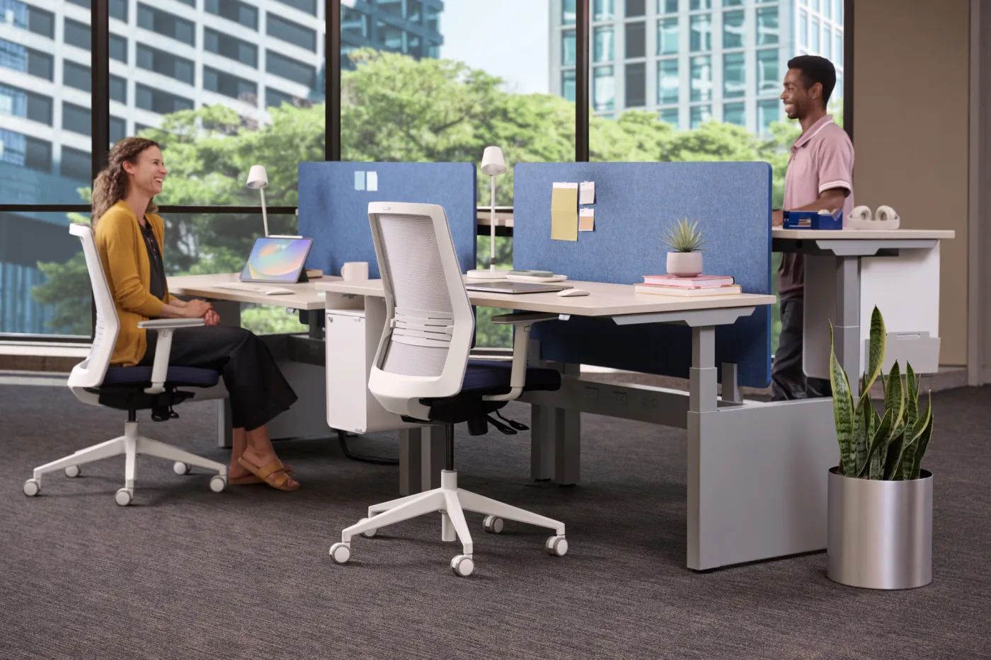 - “C-leg” design with soft cable management, privacy end panels, and clean aesthetic.