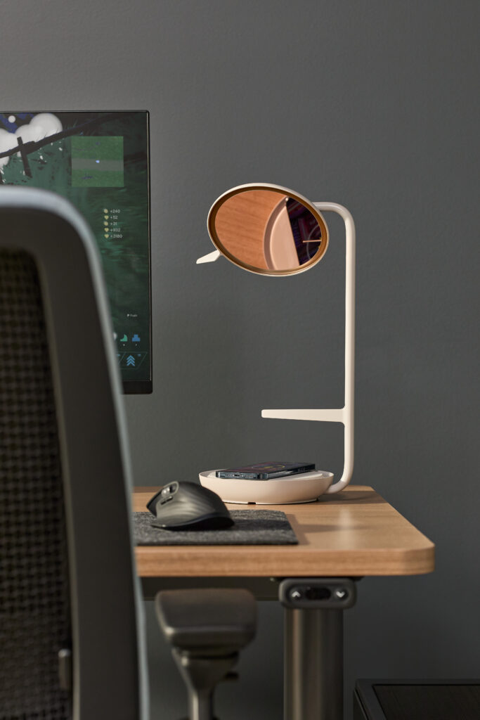 The Eclipse Light stands about 18″ tall with a compact 7.7″ × 6.6″ base, features full-range dimming, a 300° tilting head, high-CRI LED output, and a built-in 15 W wireless charging base. It’s offered in multiple modern finishes — Matte Black, Pearl Snow, and Pewter — to complement a wide range of workspace aesthetics.