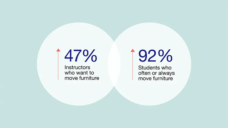 The Steelcase Learning Environment Evaluation (LEE) study has found both students and instructors have reported they want more control over their learning environments. People want options so they can choose where to learn or work and they want the ability to adapt spaces based on what they’re doing. The LEE study reports a 92% increase in students who say they often or always move furniture to support their learning. Instructors report a 47% increase when asked if they agree or strongly agree that they want to be able to move furniture into new layouts. Access to mobile furniture and different seating options and postures promote a greater sense of student agency.